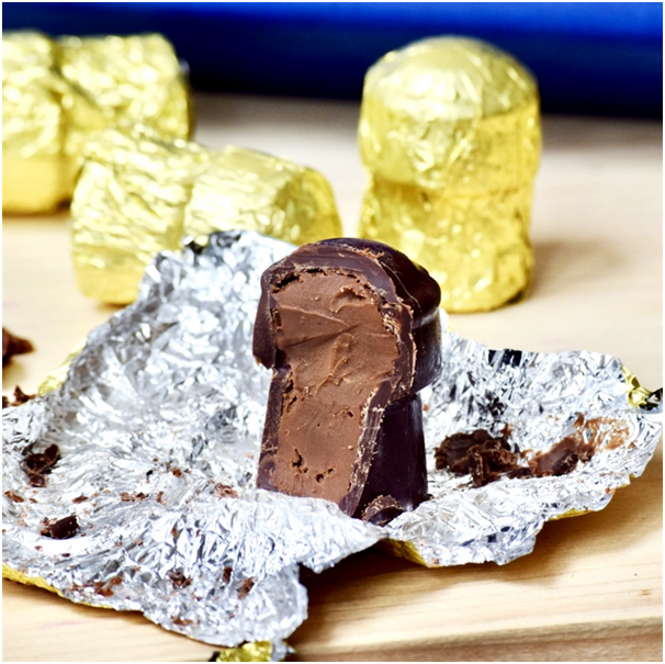 Mais alors, connaissez-vous la composition de ces fameux bouchons d’Igny ? Eh bien, déjà il y a 63% de chocolat noir, mais ce n’est pas tout ! La coque extérieure, elle, est faite à partir de : cacao, sucre, beurre de cacao, vanille Bourbon en gousse et de lécithine de colza (pour lier tous les ingrédients). Quant au fourrage,il est composé de sucre, de 15% de marc de champagne (≃ 40% vol.), de noisettes, pâte de, cacao, sirop de glucose, 6% de fine de la Marne (≃ 40% vol.), beurre de cacao et de lécithine de soja ! Miam !