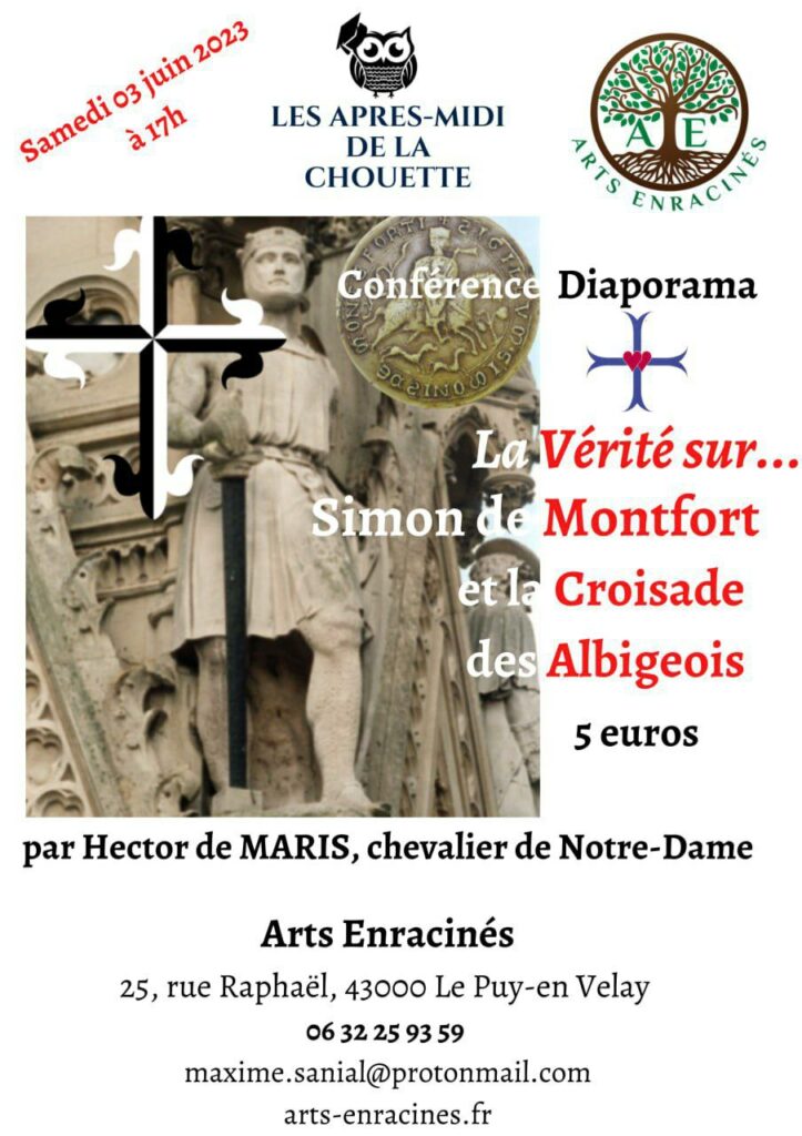 Le samedi 3 juin 2023, la Librairie Arts Enracinés (25 rue Raphaël, Le Puy-en-Velay) accueillera une conférence d’Hector de Maris, chevalier de Notre-Dame, sur Simon de Montfort et la Croisade des Albigeois.