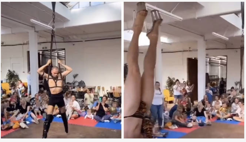 Les images de ce spectacle montrent également un « artiste » faisant le poirier sur une chaise tout en portant un string à imprimé léopard. De nombreux parents se disent horrifiées par ces scènes.