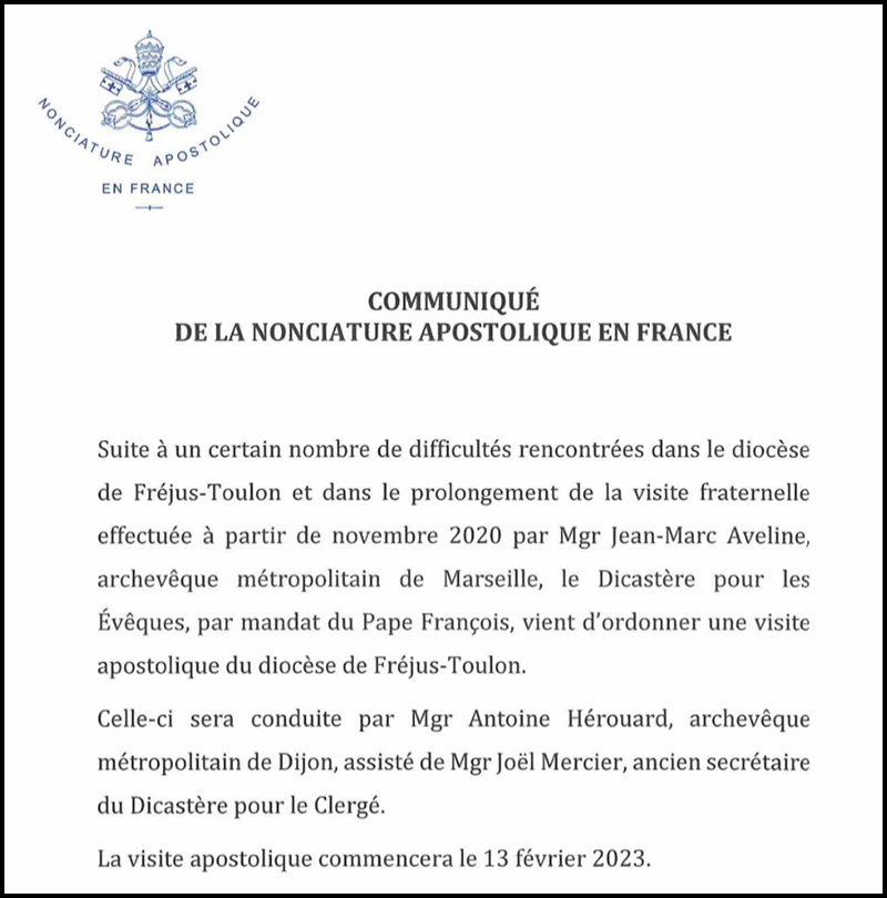 Il déclare en effet que « cette visite apostolique donnera l’occasion d’approfondir et de poursuivre le travail accompli par le cardinal Aveline lors de sa visite fraternelle. Ainsi, cela permettra d’avoir une vision plus ample et plus claire de la situation dans laquelle se trouve le diocèse de Fréjus-Toulon » (sic).