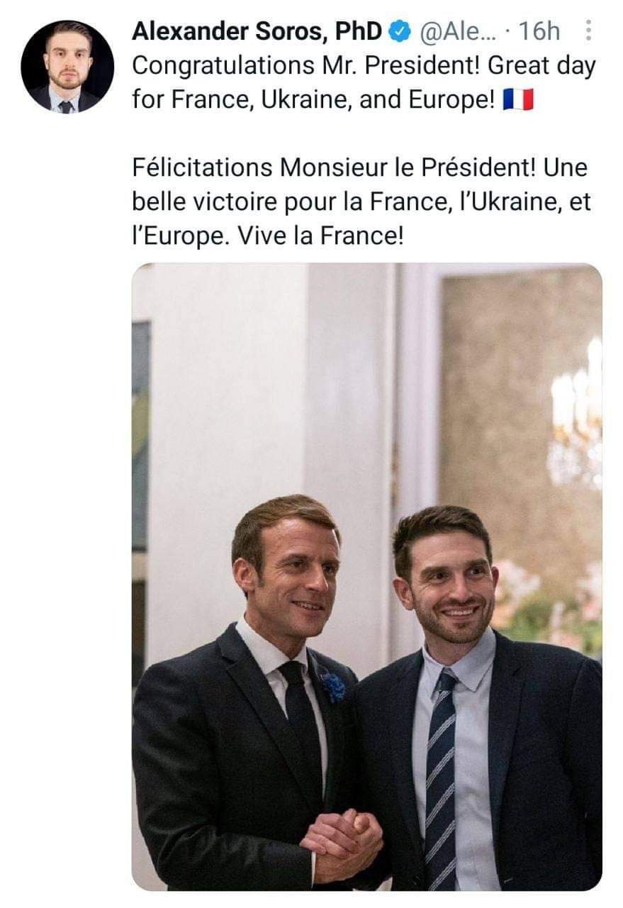 Cela n’étonnera pas nos fidèles lecteurs mais cela illustre parfaitement les collusions mondialistes : peu de temps après l’annonce de la réélection d’Emmanuel Macron, celui-ci a reçu les félicitations publiques d’Alexander Soros, fils du milliardaire cosmopolite George Soros, chargé d’assurer la pérennité du rôle subversif de l’Open Society afin de consolider le Nouvel Ordre Mondial.