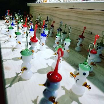Mais dans la région, il y a encore quelques artisans indépendants qui fabriquent des sujets de Noël au chalumeau ou à la canne soufflée, comme Fabrice Oberhauser souffleur de verre de père en fils depuis 7 générations. Outre les boules traditionnelles de Noël et les bonhommes de neige, il est fier de ses glaçons torsadés. En effet, la technique de fabrication et la mémoire d’une génération lui furent léguées par un ancien de son village. Là aussi le manque avait poussé les verriers à être créatifs. En effet l’ancien raconte que pendant la seconde guerre mondiale, les grands fours étaient à l’arrêt car les combustibles étaient réquisitionnés pour participer à l’effort de guerre. Alors pour décorer le sapin durant ces années marquées par la misère, les verriers avaient réutilisé des débris de verre et de vitraux des édifices bombardés pour réaliser des glaçons torsadés. Vous pouvez retrouver les créations de Fabrice sur les marchés de Noëls mosellans et alsaciens.