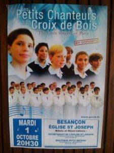 Les Petits Chanteurs de la Croix de Bois donneront un concert à Besançon le 1er octobre en l’Eglise Saint Joseph à 20h30. Ce concert est organisé par l’unité pastorale de Saint Ferréol.Au programme, musiques sacrées et spirituelles, chants des provinces de France et du monde.