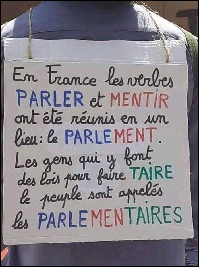 Les verbes « Parler » et « Mentir » ont été réunis en un lieu : le « PARLE–MENT« .