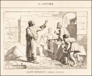 Saint Honorat naquit dans les Gaules, d’une famille illustre, mais païenne. Dieu mit de bonne heure en cet enfant prédestiné le désir du baptême, et il s’y prépara par toutes les vertus qui font l’ornement de la jeunesse. Il dut tout à la grâce et à son heureux naturel, car il avait contre lui ses parents, ses amis et le milieu corrupteur dans lequel il lui fallait vivre. Jusqu’après son baptême, son père chercha par tous les moyens possibles à le détourner de la vie chrétienne; mais, au milieu de toutes les séductions, l’invincible jeune homme se disait: « Cette vie plaît, mais elle trompe. » Dès lors, Honorat vit comme un moine, le jeûne amaigrit son visage, la prière occupe ses journées. Après quelques années d’incertitudes sur sa vraie vocation, il aborde l’île de Lérins, sur les côtes de la Provence; les serpents la rendaient inhabitable, mais ils disparaissent sous ses pas, et cette île aride et déserte devient un jardin délicieux, embaumé des fleurs de la science et de la sainteté. Par Honorat, l’Occident a trouvé aussi en lui sa Thébaïde; Lérins devient une pépinière de savants, d’évêques et de saints. A la mort de son évêque, l’église d’Arles réclame un vertueux Pontife, et la voix populaire appelle Honorat sur ce siège illustre. C’est là qu’il se surpasse lui-même et retrace en sa vie, toute de zèle et de saintes oeuvres, l’image du pasteur selon le Coeur de Dieu, dont la charité n’a d’égal que le courage inflexible à défendre les intérêts de Jésus-Christ. Saint Hilaire d’Arles, son disciple et son successeur, nous a laissé de lui un magnifique éloge. Retenons-en cette belle parole: « Si l’on voulait représenter la charité sous une figure humaine, il faudrait faire le portrait d’Honorat. »