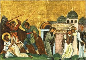 A Antioche, saint Babilas évêque. Durant la persécution de Dèce, après avoir glorifié Dieu à plusieurs reprises par ses souffrances et de cruels tourments, il termina sa noble vie dans les fers, avec lesquels il voulut que son corps fut enseveli. Avec lui, dit-on, souffrirent aussi trois enfants: Urbain, Prilidien et Epolone, qu’il avait instruits dans la foi du Christ.