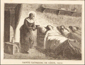 Catherine Fieschi, fille d’un vice-roi de Naples, naquit à Gênes. Sa famille, féconde en grands hommes, avait donné à l’Église deux Papes, neuf cardinaux et deux archevêques. Dès l’âge de huit ans, conduite par l’Esprit de Dieu, elle se mit à pratiquer de rudes mortifications; elle dormait sur une paillasse, avec un morceau de bois pour oreiller; mais elle avait soin de cacher ses pénitences. Elle pleurait toutes les fois qu’elle levait les yeux sur une image de Marie tenant Jésus mort dans Ses bras. Malgré son vif désir du cloître, elle se vit obligée d’entrer dans l’état du mariage, où Dieu allait la préparer par de terribles épreuves à une vie d’une incroyable sainteté. Après cinq ans d’abandon, de mépris et de froideur de la part de son mari, après cinq ans de peines intérieures sans consolation, elle fut tout à coup éclairée de manière définitive sur la vanité du monde et sur les joies ineffables de l’amour divin: « Plus de monde, plus de péché, » s’écria-t-elle. Jésus lui apparut alors chargé de Sa Croix, et couvert de sang de la tête aux pieds: « Vois, Ma fille, lui dit-Il, tout ce sang a été répandu au Calvaire pour l’amour de toi, en expiation de tes fautes! » La vue de cet excès d’amour alluma en Catherine une haine profonde contre elle-même: « O amour! Je ne pécherai plus, » s’écria-t-elle. Trois jours après, elle fit sa confession générale avec larmes, et désormais elle communia tous les jours.  Les quatre premières années de sa conversion sont vouées à la pénitence. Caterina connaît le phénomène mystique de l’inédie (jeûne total), qu’elle prolongera durant 23 carêmes et 23 avents, tout en communiant chaque jour (fait rare à l’époque). L’Eucharistie devint la nourriture de son corps et de son âme, et pendant ces vingt-trois ans il lui fut impossible de prendre autre chose que la Sainte Communion; elle buvait seulement chaque jour un verre d’eau mêlée de vinaigre et de sel, pour modérer le feu qui la dévorait, et, malgré cette abstinence, elle jouissait d’une forte santé. À l’abstinence continuelle se joignaient de grandes mortifications; jamais de paroles inutiles, peu de sommeil; tous les jours six à sept heures de prière à genoux; jamais Catherine ne se départit de ces règles; elle était surtout si détachée d’elle-même, qu’elle en vint à n’avoir plus de désir et à se trouver dans une parfaite indifférence pour ce qui n’était pas Dieu. De 1477 à 1496 se multiplient les expériences extatiques ; elle ne néglige pas pour autant l’hôpital où, pour se consacrer au service des malades indigents, elle se fait fille de salle. Entre-temps, son mari a changé de vie, et, devenu tertiaire franciscain, s’est engagé, lui aussi, à l’hôpital de Pammatone ; ils ont décidé de vivre comme frère et sÅ“ur ; Giuliano meurt en 1497. Ses trois maximes principales étaient de ne jamais dire: Je veux, je ne veux pas, mien, tien ; – de ne jamais s’excuser ; – de se diriger en tout par ces mots: Que la Volonté de Dieu soit faite! Elle meurt le 15 septembre 1510. Lorsqu’au bout de dix-huit mois, le corps de la sainte est exhumé pour être transféré de l’église de l’hôpital vers un tombeau neuf, il est retrouvé intact. Depuis 1737, année de la canonisation de Caterina par le pape Clément XII, il se trouve placé sous une châsse de verre. Une commission canonique et médicale a constaté, en 1960, la continuation du phénomène d’incorruptibilité.
