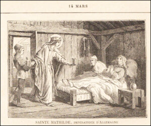 Sainte Mathilde eut pour ancêtre et pour descendants des princes remarquables, des héros fameux et de grands saints. Elle naquit dans les dernières années du IXe siècle. Sa mère, après la mort de son époux, quitta le monde et entra dans un monastère. Mathilde fut élevée par des religieuses, sous les yeux maternels. Cette éducation produisit des fruits merveilleux, et l’on ne savait ce qu’il fallait admirer davantage en elle de sa beauté, de ses progrès dans les sciences ou de son habileté dans les travaux de son sexe. Le duc Othon de Saxe, ravi de tant de belles qualités, rehaussées par une piété rare, la demanda en mariage pour son fils Henri, qui, peu d’années après, devenait empereur d’Allemagne, sous le nom d’Henri Ier. Ce prince était digne d’une telle épouse. Rarement époux eurent une si noble famille: Othon, leur fils aîné, devint empereur et mérita le titre de Grand; Brunon fut archevêque de Cologne, et l’Église l’a mis au rang des saints; une de leur filles fut reine de France. Mais la gloire de Mathilde, c’est avant tout sa sainteté. Dieu rompit bientôt les liens de ce mariage, dont l’amour divin était l’âme et dont les saintes oeuvres étaient la joie; Henri mourut, jeune encore, malgré les soins dévoués de sa sainte épouse, et sa mort fut pour Mathilde l’objet d’une longue et profonde douleur. Dès lors le monde ne fut plus rien pour elle, et elle ne s’occupa que de sa sanctification. L’oraison, les jeûnes, l’aumône, la mortification, remplirent sa vie, et les nuits suppléaient à la brièveté des jours pour prolonger ses colloques intimes avec Jésus-Christ. Elle avait coutume de réciter tout le Psautier avant le premier chant du coq. Les pauvres recevaient ses premières et ses dernières visites; elle savait si bien suffire à toutes leurs nécessités, qu’ils n’avaient qu’une voix pour l’appeler leur mère. L’épreuve est le creuset de la vertu. L’empereur, prévenu contre sa mère, l’exila; mais ce coup douloureux, qu’elle supporta avec une angélique patience, fut bientôt suivi d’une éclatante réparation. Peu de temps avant sa mort, Mathilde se retira dans un couvent pour se préparer à la mort. On la vit descendre au rang des simples religieuses, remplir avec joie les plus viles fonctions, et donner à toute la communauté l’exemple d’une régularité parfaite. Elle mourut couchée sur un cilice recouvert de cendres, le 14 mars 968.
