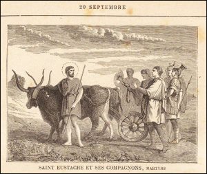 Eustache, qui portait aussi le nom de Placide, et que sa naissance, ses richesses et sa gloire militaire distinguaient parmi les Romains, mérita, sous l’empereur Trajan, le titre de maître de la milice. Un jour que, se livrant à l’exercice de la chasse, il poursuivait un cerf d’une taille prodigieuse qui fuyait devant lui, cet animal s’arrêta tout à coup et Eustache put voir, entre ses bois, une image grandiose et resplendissante de notre Seigneur Jésus-Christ attaché en croix. Sur l’invitation que le Sauveur lui fit entendre de prendre pour but de ses poursuites la vie immortelle, il s’enrôla dans la milice chrétienne avec son épouse Théopista, et leurs deux enfants en bas âge, Agapit et Théopiste. Étant retourné bientôt, comme le Seigneur le lui avait ordonné, au lieu même où la vision s’était produite, il l’entendit lui prédire tout ce qu’il aurait à supporter dans la suite pour sa gloire. Peu après il souffrit avec une patience admirable d’incroyables calamités, et se vit bientôt réduit à la plus profonde misère. Obligé de fuir en secret, il se vit enlever dans la suite, son épouse d’abord, puis ses enfants, malheureusement arrachés à son affection. Le cœur déchiré par tant d’épreuves.il demeura longtemps caché dans une région lointaine, cultivant la terre, jusqu’à ce que, réconforté par une voix céleste et repris par Trajan pour une nouvelle guerre, il fût de nouveau placé à la tête des troupes. Durant l’expédition qu’il dirigea, il eut la joie inespérée de recouvrer ses enfants et son épouse. Vainqueur, il entra dans Rome au milieu des acclamations de tous. Mais peu après, ayant reçu l’ordre de sacrifier aux faux dieux pour les remercier de sa victoire, il s’y refusa énergiquement. En vain essaya-t-on par divers moyens de lui faire renier la foi du Christ. On l’exposa aux lions avec sa femme et ses enfants ; la douceur que ces animaux montrèrent à leur égard ayant irrité l’Empereur, celui-ci ordonna d’enfermer les saints Confesseurs dans un taureau d’airain, rougi par le feu qui brûlait au-dessous. Consommant ainsi leur martyre et chantant les louanges divines, ils s’envolèrent vers la félicité éternelle, le douze des calendes d’octobre. Leurs corps, retrouvés intacts, furent religieusement ensevelis par les fidèles, puis transférés avec honneur dans l’église édifiée sous leur vocable.