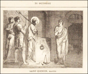 Saint Quentin fut un de ces jeunes Romains qui, comme saint Crépin et saint Crépinien, vinrent prêcher l’Évangile dans les Gaules et y communiquer le trésor de la foi qu’ils avaient reçu. Amiens fut le centre de son apostolat. Les miracles confirmaient son enseignement; il traçait le signe de la Croix sur les yeux des aveugles, et ils voyaient; il faisait parler les muets, entendre les sourds, marcher les paralytiques. Ces éclatants prodiges excitaient l’admiration des uns et la haine des autres. Quentin fut bientôt dénoncé à ce monstre de cruauté qui avait nom Rictiovarus, gouverneur romain, et il comparut devant lui: « Comment t’appelles-tu? lui demande le tyran. Je m’appelle chrétien. Mon père est sénateur de Rome; j’ai reçu le nom de Quentin. Quoi! un homme de pareille noblesse est descendu à de si misérables superstitions! La vraie noblesse, c’est de servir Dieu; la religion chrétienne n’est pas une superstition, elle nous élève au bonheur parfait par la connaissance de Dieu le Père tout-puissant et de Son Fils, engendré avant tous les siècles. Quitte ces folies et sacrifie aux dieux. Jamais. Tes dieux sont des démons; la vraie folie, c’est de les adorer. Sacrifie, ou je te tourmenterai jusqu’à la mort. Je ne crains rien; tu as tout pouvoir sur mon corps, mais le Christ sauvera mon âme. » Une si généreuse confession est suivie d’une flagellation cruelle; mais Dieu soutient Son martyr, et l’on entend une voix céleste, disant: « Quentin, persévère jusqu’à la fin, Je serai toujours auprès de toi. » En même temps, ses bourreaux tombent à la renverse. Jeté dans un sombre cachot, Quentin en est deux fois délivré par un Ange, va prêcher au milieu de la ville, et baptise six cents personnes. Tous ces prodiges, au lieu de calmer le cruel Rictiovarus, ne servent qu’à allumer sa fureur. Il envoie reprendre le martyr et le fait passer successivement par les supplices des roues, des verges de fer, de l’huile bouillante, de la poix, des torches ardentes: « Juge inhumain, fils du démon, dit Quentin, tes tourments me sont comme un rafraîchissement. » Le tyran invente alors un supplice d’une férocité inouïe et fait traverser le corps du martyr, de haut en bas, par deux broches de fer; on lui enfonce des clous entre la chair et les ongles. Enfin l’héroïque Quentin eut la tête tranchée. Les assistants virent son âme s’envoler au Ciel sous la forme d’une blanche colombe.