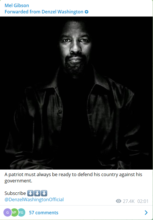Mel Gibson exprime aussi sur Telegram son soutien total à l’acteur Denzel Washington dont nous avons déjà signalé le message audacieux mis sur Telegram : « Un patriote doit toujours être prêt à défendre son pays contre son gouvernement« .