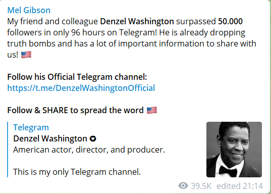 En 96 heures, Denzel Washington a rassemblé plus de 50.000 followers sur Telegram.