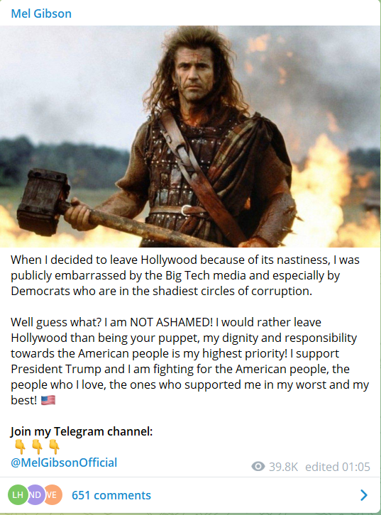 L’acteur et réalisateur Mel Gibson publiait il y a quelques jours ce message sur Telegram :