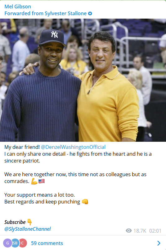 Un autre acteur fait également entendre sur Telegram son soutien aux messages patriotiques et anti-Système de Denzel Washington : Sylvester Stallone. Comme Mel Gibson, Sylvester Stallone relaye sur Telegram les messages audacieux de Denzel Washington.