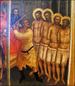 A Rome, sur la voie Lavicane, à trois mille de la Ville, la passion des saints martyrs Claude, Nicostrate, Symphorien, Castorius et Simplice. Mis en prison d’abord, ils furent ensuite cruellement déchirés avec des scorpions, mais comme ils demeuraient inébranlables dans leur foi au Christ, Dioclétien ordonna de les précipiter dans le fleuve.