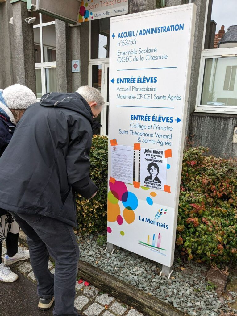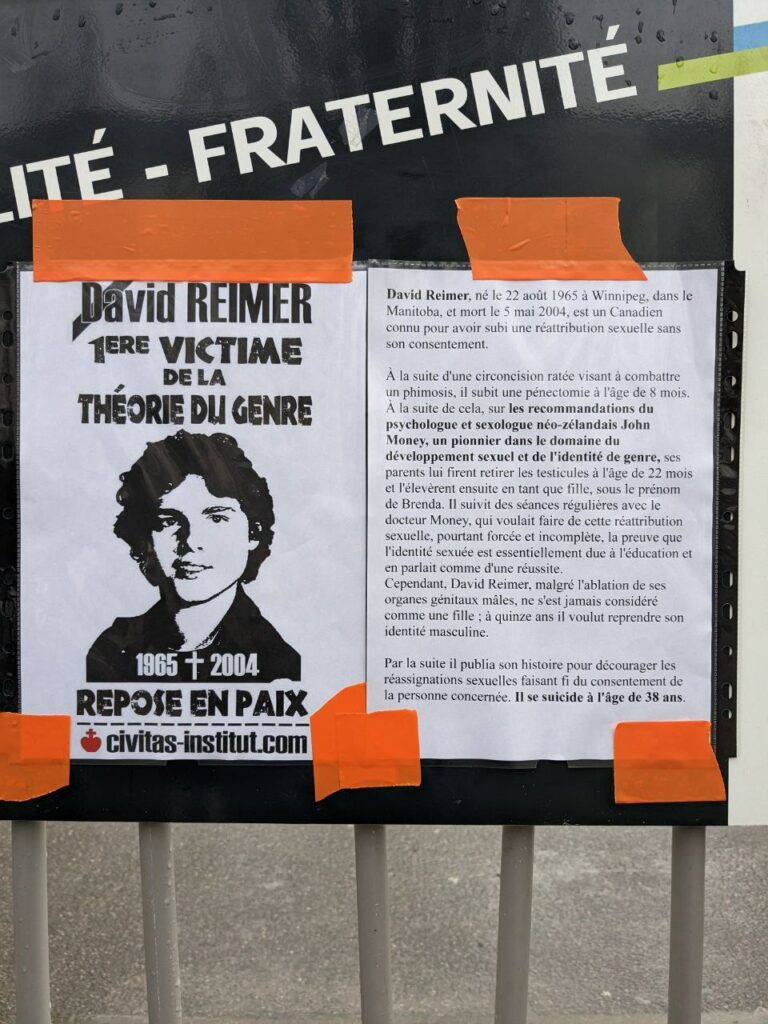 Des affichettes ont été collées en mémoire de David Reimer, l’une des victimes de cette propagande transgenre.