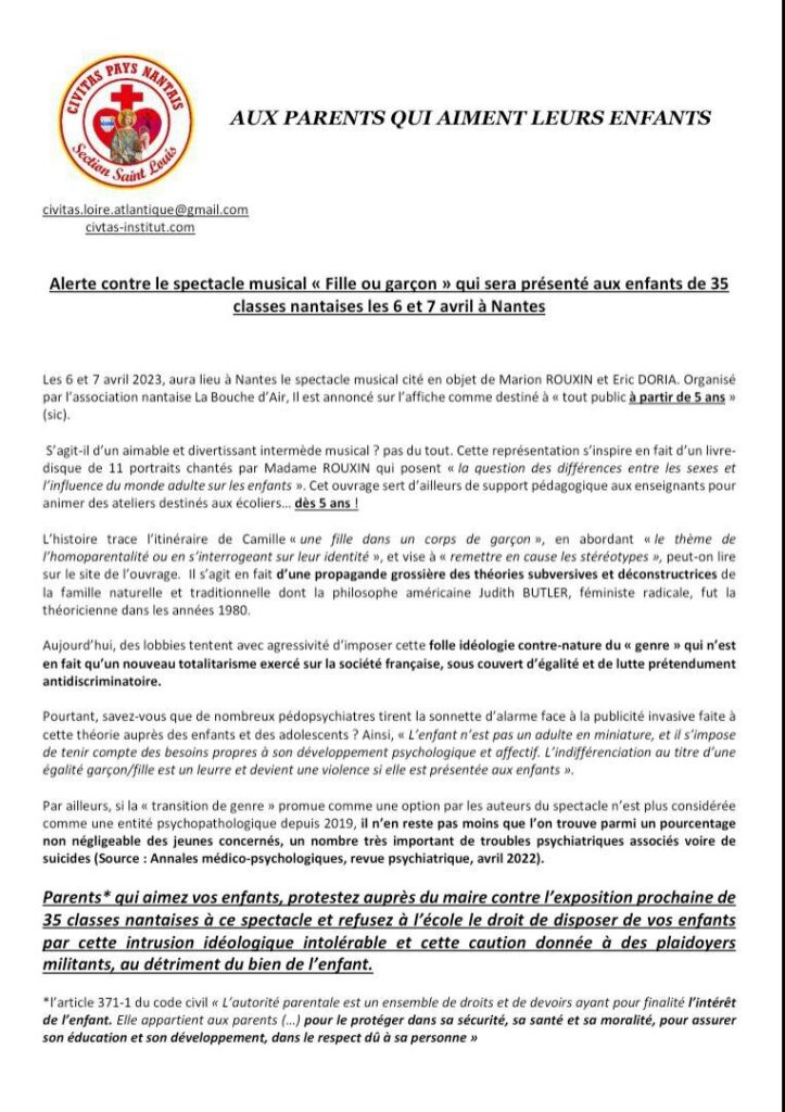 Samedi matin, des militants nantais de Civitas ont organisé un tractage et un collage autour de 12 écoles contre un spectacle musical véhiculant la théorie du genre à destination d’enfants de 5 ans et plus, qui sera joué à Nantes les Jeudi et Vendredi Saints prochains. Ce genre de déséducation étant humanicide, il faut aider « les parents qui aiment leurs enfants » !