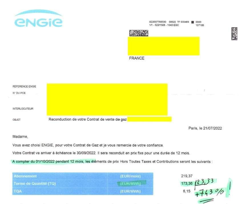 Nous apprenons à l’issue de notre période de congés, que notre fournisseur ENGIE va appliquer une hausse tarifaire de gaz à compter du 01.10.2022 passant le MWh de 23.33 € (ancien tarif) à 173.36 € (voir en PJ copie certifiée conforme de notre ancien tarif et la correspondance de ce fournisseur pour le nouveau tarif).