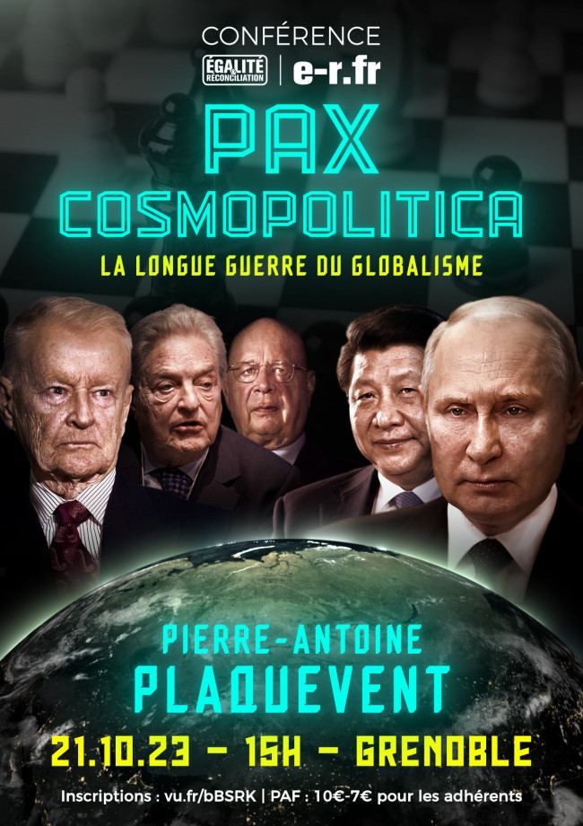 E&R Grenoble recevra Pierre-Antoine Plaquevent le samedi 21 octobre 2023 à 15h à Grenoble pour une conférence sur le thème « Pax cosmopolitica : la longue guerre du globalisme ».