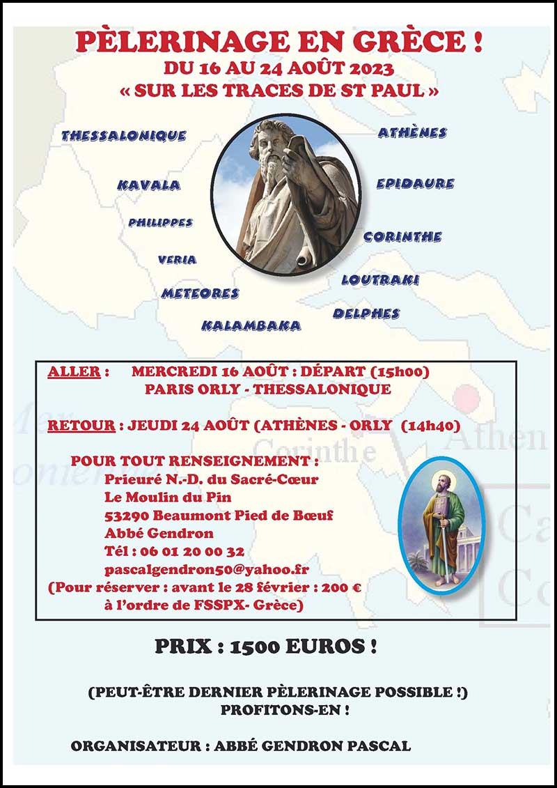 Le prieuré Notre-Dame du Sacré-Coeur et l’abbé Pascal Gendron vous invitent à vous inscrire au pèlerinage en Grèce qui aura comme thème « Sur les traces de saint Paul ».