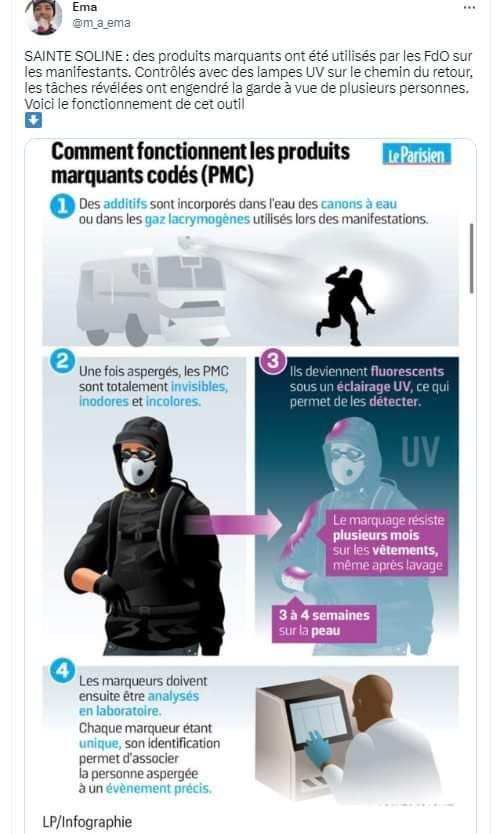 Au détour d’un article sur les violents affrontements lors de la manifestation de Sainte Soline, on en apprend un peu plus sur l’évolution des techniques de produits marquants codés utilisés par la police et la gendarmerie.