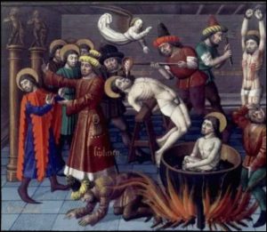 Boniface, citoyen romain, avait eu des rapports illicites avec une noble dame, nommée Aglaé ; il fut saisi d’une telle douleur de cette faute que pour en faire pénitence, il se consacra à rechercher et à ensevelir les corps des Martyrs. Ayant quitté ses compagnons de voyage, et voyant que dans la ville de Tarse, on mettait à la torture et on tourmentait de diverses manières beaucoup de Chrétiens à cause de leur foi, il baisa leurs liens et les exhorta avec véhémence à supporter courageusement jusqu’au bout des supplices dont la douleur passagère serait suivie d’un repos éternel. Il fut arrêté, et on déchira son corps avec des ongles de fer ; on lui enfonça aussi des roseaux pointus sous les ongles des mains, et on lui versa du plomb fondu dans la bouche. Au milieu de ces tourments on ne lui entendait dire que ces paroles : « Je vous rends grâces, Seigneur Jésus-Christ, Fils de Dieu ». On jeta ensuite Boniface la tête en bas dans une chaudière de poix bouillante, mais il en fut retiré sain et sauf ; alors le juge transporté de colère, ordonna de lui trancher la tête. Au même moment il se fit un grand tremblement de terre, et ce prodige convertit beaucoup d’infidèles à la foi du Seigneur Jésus-Christ. Le jour suivant, ses compagnons qui le cherchaient, ayant appris qu’il avait souffert le martyre, rachetèrent son corps pour cinq cents pièces d’argent, et, l’ayant embaumé et enveloppé de linceuls, ils le firent transporter à Rome. Aglaé, qui, elle aussi, s’était vouée à la pénitence et aux œuvres de piété, ayant connu par un Ange ce qui s’était passé, alla au-devant des saintes reliques, et bâtit une église sous le nom de Boniface. Le corps du Martyr fut enseveli aux nones de juin ; son âme était partie pour le ciel, la veille des ides de mai, à Tarse, en Cilicie, sous les empereurs Dioclétien et Maximien.