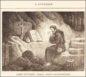 Parmi les jeunes seigneurs de la cour de Clovis qui abjurèrent le paganisme après la bataille de Tolbiac, il y avait un brillant officier nommé Léonard. Pour des hommes de cette trempe, la vertu commune ne suffit pas : il se fit moine. A l’école de saint Rémi, près duquel il se fixa, il fit de rapides progrès dans la vertu. « Il était, dit son historien, affable dans ses entretiens, fidèle à ses promesses, prodigue par ses aumônes, modeste en ses paroles, humble et simple en tout. » Clovis, informé par la voix publique de sa sainteté et des merveilles que Dieu opérait par ses main, voulut le faire évêque ; mais Léonard refusa : « Eh bien ! lui dit le roi, demandez-moi quelque grâce, je vous l’accorderai. O prince ! dit Léonard, accordez-moi le pouvoir de visiter les prisons et de délivrer les prisonniers que je jugerai dignes de cette faveur. » Clovis fut heureux d’y consentir. Le saint moine passa quelques temps à Orléans, près de saint Mesmin, abbé de Mici, pour se former aux règles de la vie monastique, puis il traversa le Berry, où il prêcha la foi à des populations encore païennes et obtint un succès immense par sa parole et par ses nombreux miracles. De là il se rendit en Aquitaine et chercha un lieu solitaire pour se livrer à la prière et à la contemplation des choses célestes. Il trouva cette retraite dans une forêt, près de Limoges, et y mena, pendant vingt ans, une vie plus angélique qu’humaine, dont Dieu seul a le secret, mais que nous pouvons nous représenter en nous reportant à la vie des plus illustres anachorètes. A sa parole, une source d’eau vive sortit de terre pour alimenter son ermitage. La solitude de ces lieux autrefois sauvages fut bientôt envahie. Une infinité de malades se faisaient transporter auprès du Saint et obtenaient leur guérison ; d’autres venaient entendre sa parole et recevoir ses avis. Mais surtout les prisonniers échappés de leur cachot par l’effet de ses prières venaient lui présenter leurs fers en hommage, et recevoir de lui les leçons de la pénitence et de la vie chrétienne.