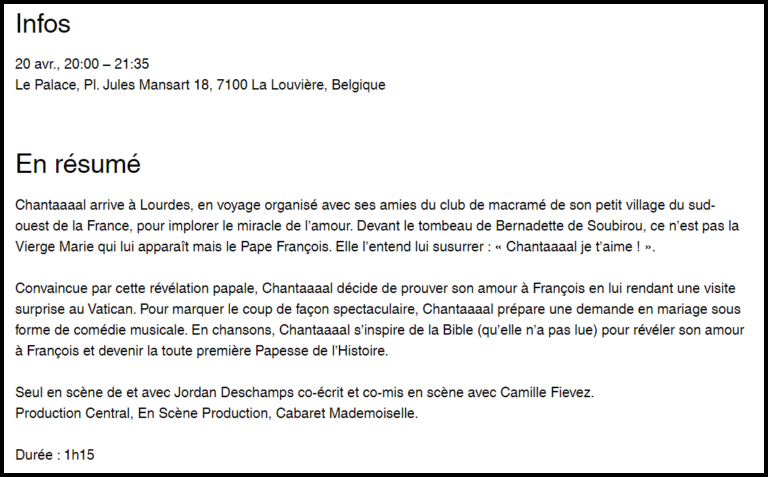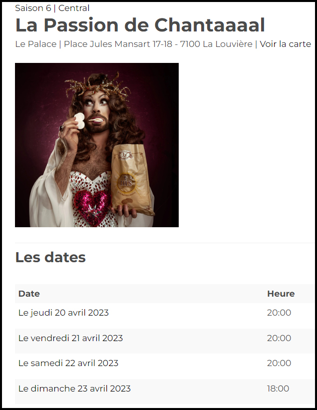 La Belgique n’est pas épargnée par la vague de propagande transgenre. Un spectacle drag queen blasphématoire intitulé La Passion de Chantaaaal est prévu à La Louvière (Hainaut) à partir du 20 avril 2023. (que ceux qui ne nous croient pas cliquent ici pour visualiser cette horreur)
