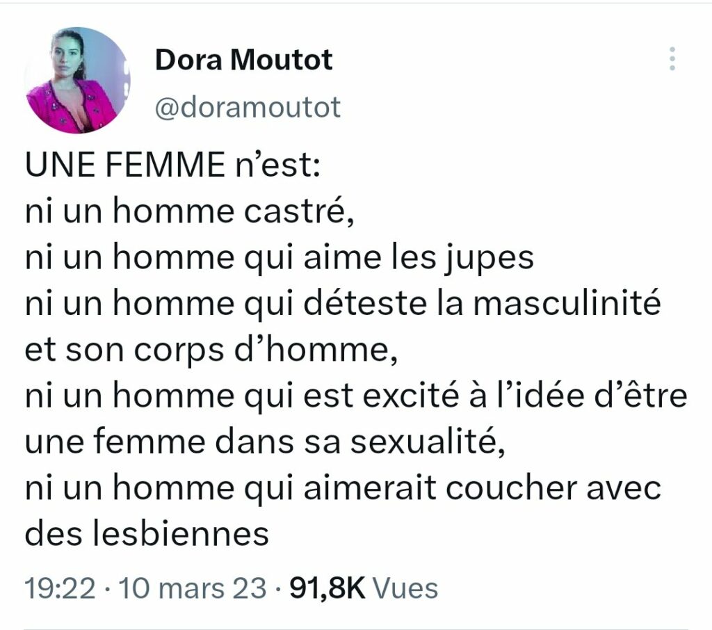 La folie de notre temps amène à des situations inattendues. Prenons le cas de Dora Moutot, très engagée depuis plusieurs années dans la mouvance féministe et plutôt du genre à prendre la défense des homosexuels et des lesbiennes. Jusqu’il y a peu, elle avait donc tout pour plaire aux idéologues du nouvel ordre mondial sexuel.