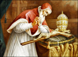 Pie, né dans une ville du Piémont nommée Bosco, de la noble famille des Ghisleri, originaire de Bologne, entra à l’âge de quatorze ans dans l’Ordre des Frères Prêcheurs. On remarquait en lui une admirable patience, une profonde humilité, une très grande austérité de vie, une application continuelle à l’oraison, et le zèle le plus ardent pour l’observance régulière et la gloire de Dieu. Il s’adonna à l’étude de la philosophie et de la théologie, et excella tellement dans ces sciences, qu’il s’acquitta avec un grand succès de la charge de les enseigner. Il fit en plusieurs lieux des conférences sacrées très fructueuses, remplit longtemps avec une force d’âme inviolable les fonctions d’inquisiteur, et préserva, au péril même de sa vie, un grand nombre de villes de l’hérésie qui s’efforçait de les envahir. Paul IV, à qui ses vertus le rendaient cher, le promut d’abord à l’évêché de Népi et Sutri, et, deux ans après, le mit au rang des Cardinaux Prêtres de l’Église romaine. Transféré par Pie IV au siège de Mondovi, dans le Piémont, il reconnut que beaucoup d’abus s’étaient introduits dans cette Église, et fit la visite de son diocèse pour les extirper. Lorsque toutes choses furent remises en ordre, il revint à Rome, où il fut occupé des négociations les plus importantes dans l’expédition desquelles il prit toujours le parti de la justice, et déploya une liberté apostolique et une grande constance. A la mort de Pie IV, il fut élu Pape, contre l’attente générale ; mais, sauf l’extérieur, il ne changea rien à sa manière de vivre. Il eut un zèle incessant pour la propagation de la foi, une sollicitude infatigable pour le rétablissement de la discipline ecclésiastique, une vigilance assidue pour l’extirpation des erreurs, une bienfaisance inépuisable pour soulager les nécessités des indigents, un courage invincible pour défendre les droits du siège apostolique. Le sultan des Turcs, Sélim, dont les succès avaient accru l’audace, ayant réuni une flotte nombreuse près des îles Cursolaires, fut vaincu à Lépante, grâce à Pie V, et plus encore au moyen des prières adressées à Dieu qu’au moyen des armes. Ce Pontife connut cette victoire par une révélation divine à l’heure même où elle fut obtenue, et il l’annonça aux personnes qui se trouvaient avec lui. Il préparait une nouvelle expédition contre les Turcs lorsqu’il tomba gravement malade ; il supporta avec une grande patience de très cruelles douleurs, et étant arrivé à l’extrémité, reçut les sacrements selon l’usage, puis rendit son âme à Dieu dans une paix profonde, le 1er mai de l’an mil cinq cent soixante-douze, âgé de soixante-huit ans, après avoir siégé six ans, trois mois et vingt-quatre jours. Son corps est l’objet d’une grande vénération de la part des fidèles dans la basilique de Sainte Marie-Majeure. Dieu opéra de nombreux miracles en faveur de ceux qui recouraient à l’intercession de Pie V, et ces prodiges ayant été prouvés juridiquement, il fut béatifié par Clément X le 1er mai 1672 et a été inscrit au nombre des Saints par le Souverain Pontife Clément XI le 22 mai 1712.