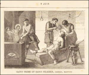 Prime et Félicien étaient frères. Pendant la persécution de Dioclétien et de Maximien, ils furent accusés de professer la religion chrétienne et jetés dans les fers ; mais un Ange brisa leurs liens et les rendit à la liberté. On ne tarda pas à les amener devant le préteur, et là ils persévérèrent énergiquement dans la foi chrétienne ; alors on les sépara l’un de l’autre. La constance de Félicien fut d’abord mise à l’épreuve de diverses façons. Mais les conseillers d’impiété désespérant d’obtenir quoi que ce soit par leurs paroles, clouèrent ses pieds et ses mains à un tronc d’arbre, et le laissèrent ainsi suspendu pendant trois jours sans boire ni manger. Le lendemain, le préteur fit mander Prime et lui dit : « Vois combien ton frère est plus sage que toi : il a obéi aux empereurs, et ils l’ont comblé d’honneurs. Si tu veux l’imiter, tu partageras les mêmes faveurs et les mêmes grâces. Prime répondit : « J’ai appris par un Ange ce qu’on a fait à mon frère. Plaise à Dieu que je lui sois uni dans le martyre comme je lui suis uni par la volonté ! » A ces paroles le préteur s’emporta et, sans compter les tourments qu’il fit subir à Prime, cette fois sous les yeux de Félicien, il ordonna encore de lui verser du plomb fondu dans la bouche. Bientôt il les fit conduire tous deux à l’amphithéâtre, où deux lions furent lâchés sur eux ; mais ces animaux se couchèrent à leurs pieds et les caressèrent de la tête et de la queue. Sur plus de douze mille hommes venus à ce spectacle, cinq cents embrassèrent avec leurs familles la religion chrétienne. Le préteur troublé de ces faits, donna l’ordre de trancher la tête à Prime et à Félicien. Les martyrs reposèrent d’abord à Mentana (Italie). Le pape Théodore 1er (+649) les transféra dans l’église Saint-Étienne sur le mont Cœlius (on peut y voir leurs images en mosaïque).