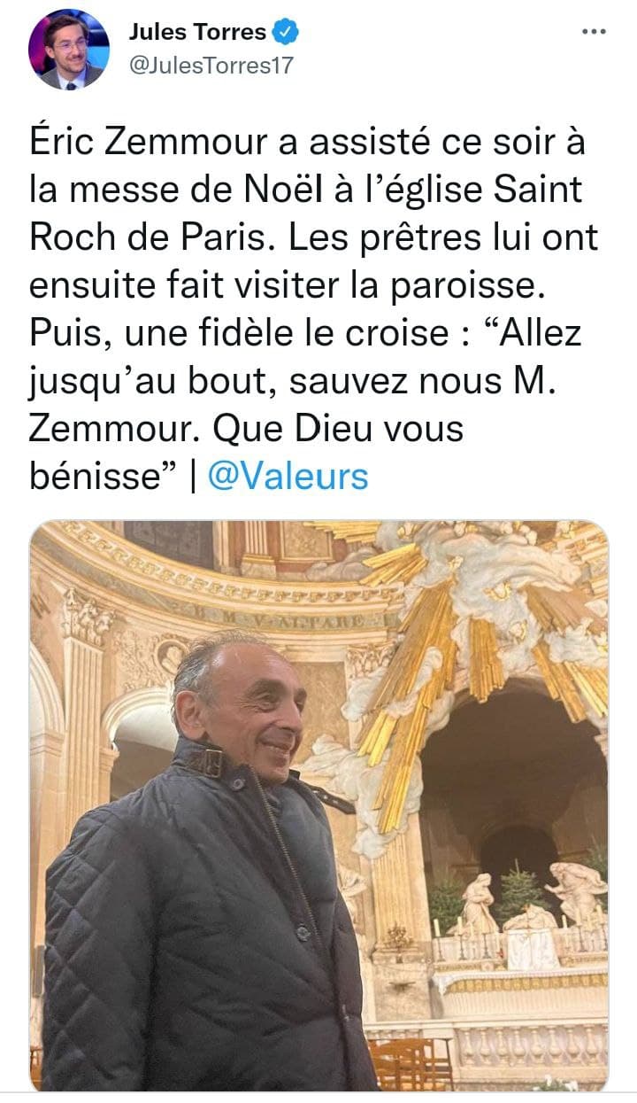 Un écho sur Twitter laisse penser qu’Eric Zemmour a assisté à la messe de minuit à Noël à St Roch (Paris), célébrée en rite tridentin.